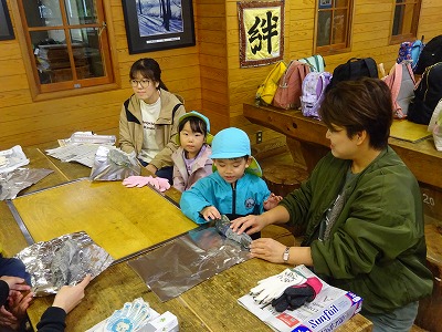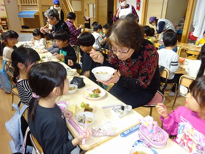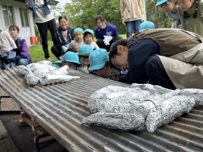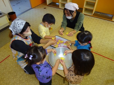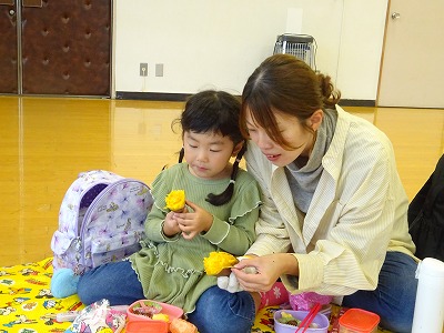 菊の花をばらしたり、しめじを割いたり、お仕事はみんなで分担作業。年長さんはさつまいもや大根を包丁で切りました。包丁の使い方を教えてくれたのは近所のおばあちゃん達。お鍋が煮えるまで絵本を読んでもらいました。またある日の年中さん、飯豊少年自然の家におじゃまして親子で「やき芋づくり」に挑戦しました。みんなの力を結集して完成した「さつま汁」と、ホクホク甘い焼き芋。自然の恵みに感謝しながら、みんなで味わう秋の味覚!「おなか」も「こころ」も満たされ、みんな笑顔がいっぱいでした。
