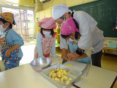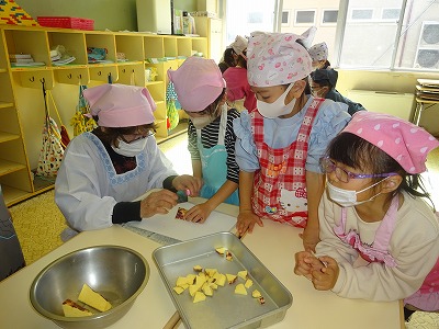 収穫した秋の食材を使って、みんなでクッキング活動をしました。
