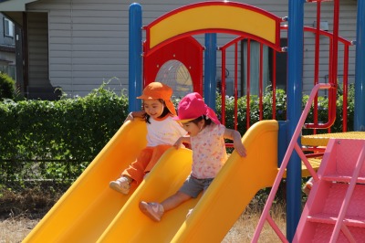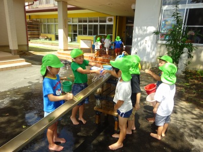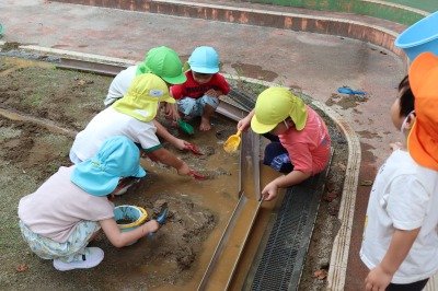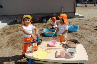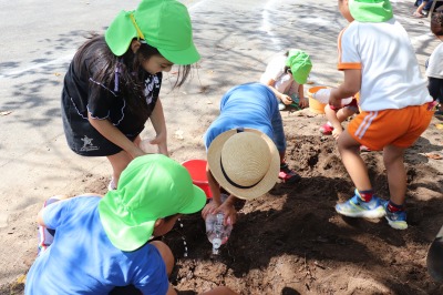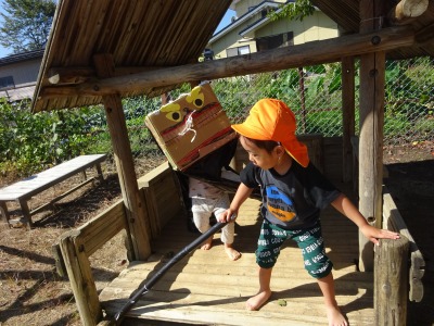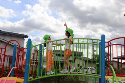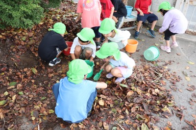待っていましたとばかりに子ども達が外に飛び出してきました。暑い時期も、室内で色々考えながら遊びを発展させてきた子ども達ですが、やっぱり外の世界はおもしろい!!近年、異常気象の影響で外で遊べる時期がどんどん短くなっていますね。子ども達と一緒に居ると、深呼吸したくなる清々しさの中、外でおもいきり身体を動かせる今が貴重な時間だと気づかされます。秋はたくさん戸外活動を取り入れ、五感をフルに使って自然との一体感を楽しんでいきたいと思います。